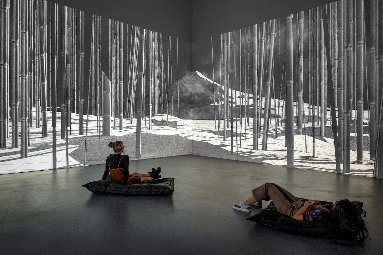 Fuji by Studio Lemercier is part of an ongoing series about volcanoes. It combines a large-scale, hand-drawn landscape depicting Fujiyama, augmented by a layer of projected light. The abstract narratives are inspired by the legend of Kaguya Hime, a folktale from the 10th Century and a key element in Japanese culture. It gives an imaginary and poetic vision of this story in an immersive environment. Studio Lemercier is primarily focused on projections of light in space and its influence on our perception.