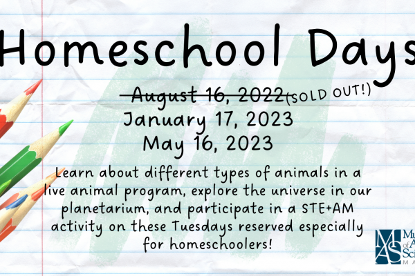 Learn about different types of animals in a live animal program, explore the universe in our planetarium, and participate in a STE+AM activity on these Tuesdays reserved especially for […]