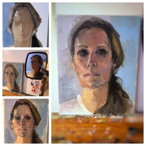 Each Monday, we can share our progress (or not). I can be available to help solve problems and add my expertise. I have decided to do a series of three self-portraits; I am involved in a rigorous, online, painting-a-day class with Duane Keiser, an artist from Richmond, Virginia, where I was born and raised. Since I’ll be painting every day throughout the month, I figured I could insert three self-portraits and meet both requirements. Here is my first one; I’ve included the process shots. One of the important aspects of our project together is the vulnerability to share our work even though it feels wrong, unfinished, or ‘not good enough.’ Those attitudes are a detriment to creating and serve no good, so I begin with putting mine out here. I felt the way this looks, so I am satisfied by the hour and a half of the work I did.